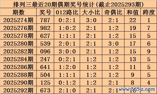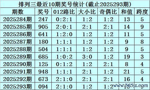 上期回归:罗列三2025293期奖号为094,奇偶比为1:2,大小比为1:2,跨度为13。